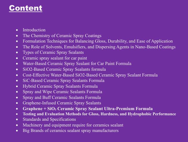 Starting the production of car ceramic sealants spray products through our Chemical Formula Services is essential to ensure success. Our service provides comprehensive technical knowledge, guiding you step-by-step from sourcing raw materials to creating a finished product. We simplify complex formulations, ensuring you understand the necessary components, their functions, and the precise manufacturing process. By leveraging our expertise, you can efficiently produce high-quality, durable. It is effective ceramic spray sealants that meet industry standards, enhancing your product portfolio and market competitiveness.