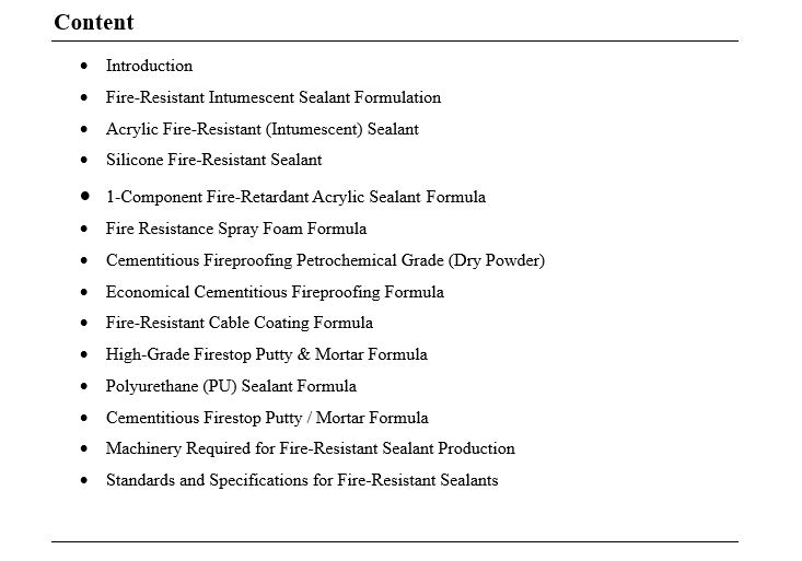 The content covers a full spectrum of topics—from foundational chemistry and raw material selection to advanced intumescent systems, hybrid polymers, and international compliance standards such as ASTM E814, UL-1479, BS-EN 1366-4, EN 15080, and ISO 834. Each formulation is accompanied by clear explanations, processing techniques, testing requirements, troubleshooting guidelines, and scalable manufacturing tables to support both laboratory development and industrial production.