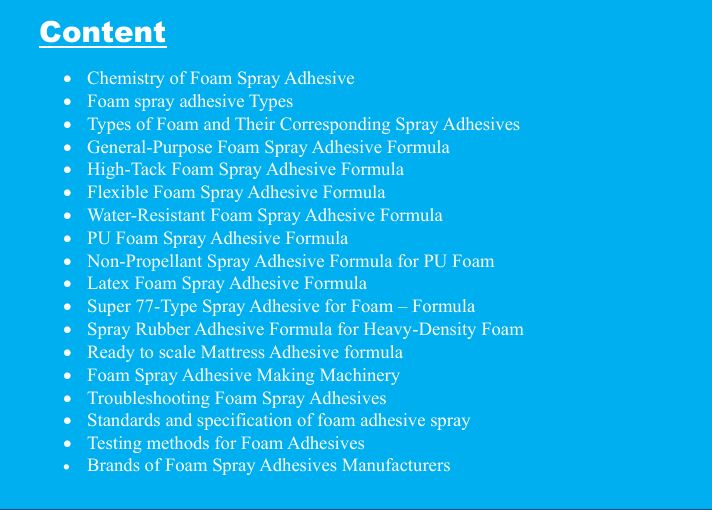 Overview: Starting a foam spray adhesive business presents a lucrative opportunity to revolutionize the foaming industry, targeting key applications such as mattresses, cushions, and various foam-joining processes. By leveraging advanced formulations developed by our Formula Services (CFS), you can introduce versatile, quick-setting adhesives that cater to the growing demands of the market. These products will be designed for ease of use, safety, and superior performance, positioning your business as a leader in this sector.