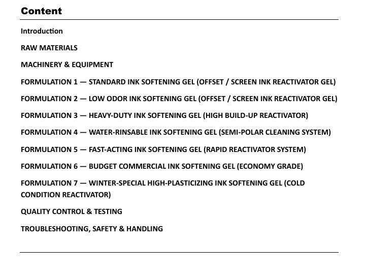 The CFS Ink Softening Gel Formula package includes full manufacturing procedures, raw material specifications, process control parameters, quality testing guidelines, and stability validation protocols. It is designed for manufacturers, chemical formulators, and industrial maintenance product producers seeking a commercially viable ink reactivator system.