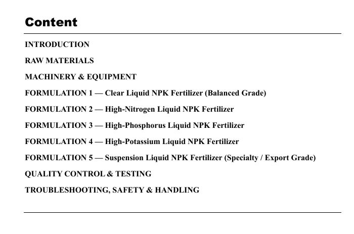 Depending on nutrient ratios, raw material solubility, and application requirements, liquid NPK fertilizers may be produced as clear solutions or stable suspension concentrates. The formulations covered in this book are designed to ensure nutrient availability, physical stability, and compatibility with modern agricultural application equipment.